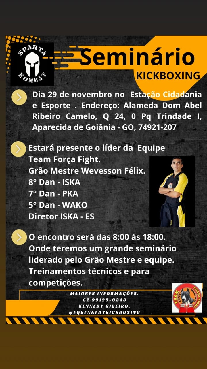 Neste sábado (29) a equipe Spart Kombat e Team Força Figth estarão realizando um seminário sobre o Kickboxing, na estação Cidadania e Esporte, no Parque Trindade, em Aparecida de Goiânia. O evento está sendo produzido Mestre Kennedy Ribeiro da Team Força e terá a presença do Grão Mestre Wevesson Félix, campeão mundial.