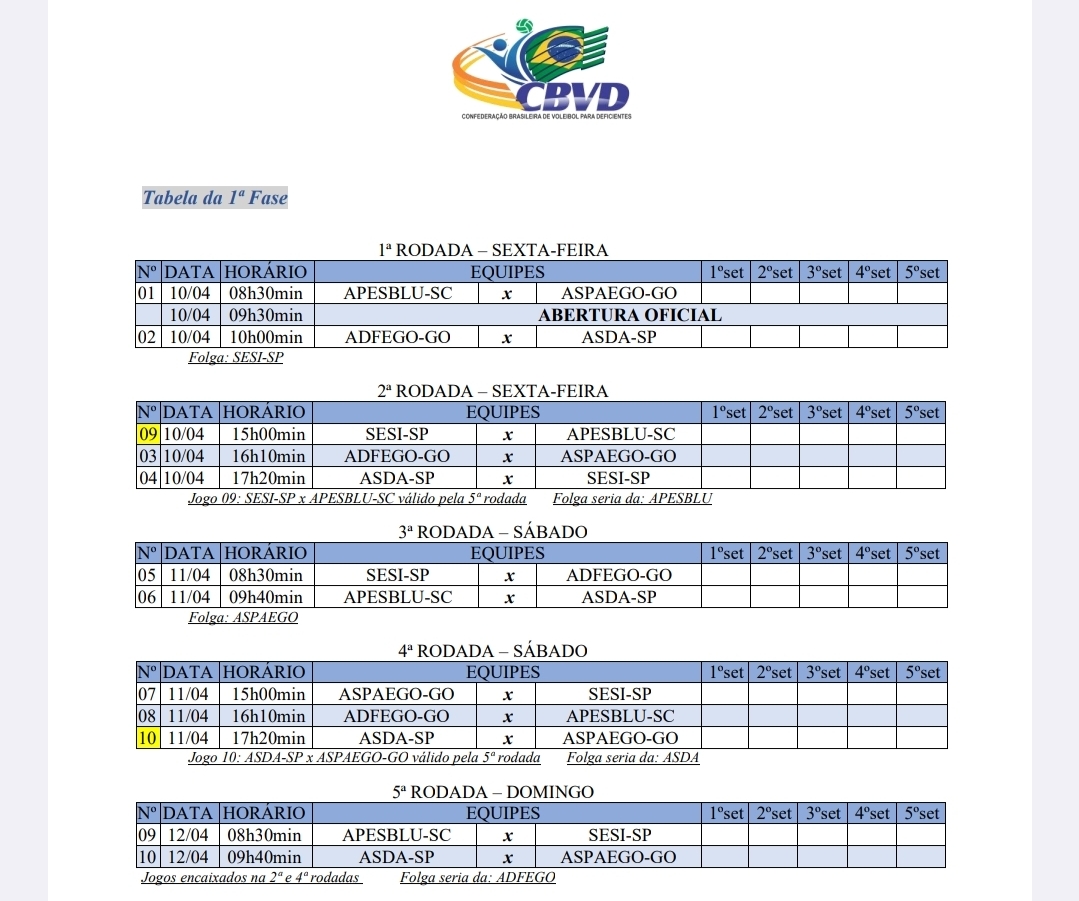 Duas equipes goianas participam da temporada 2026 do Campeonato Brasileiro de Vôlei Sentado. A primeira das quatro fases será disputada em Sorocaba, entre os dias 10 e 12 de abril. Aspaego e Adfego representam o esporte goiano.