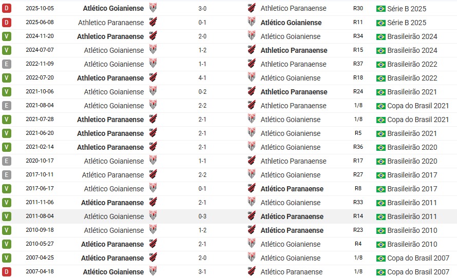 O Furacão marcou 38 gols enquanto que os goianos apenas 21, a vitória mais elástica do confronto é do time paranaense. Em 2022, na 18° rodada da Série A, venceu por 4×1. Ocorreram ainda três placares de 3×0, dois do CAP e um do ACG.