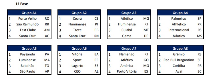 O torneio conta com 32 equipes divididas em oito grupos, cada um com quatro times. O Atlético está no grupo 7, ao lado de Flamengo, América-MG e Porto Vitória. A estreia será dia 26 diante do América-MG, às 15h, no Zico Brandão, em Inhumas. O segundo jogo marcado para dia 3 de maio diante do Porto Vitória, no mesmo horário e local. O último duelo da fase classificatória será fora de casa, diante do Flamengo, dia 10 de maio, na Gávea, também às 15h.