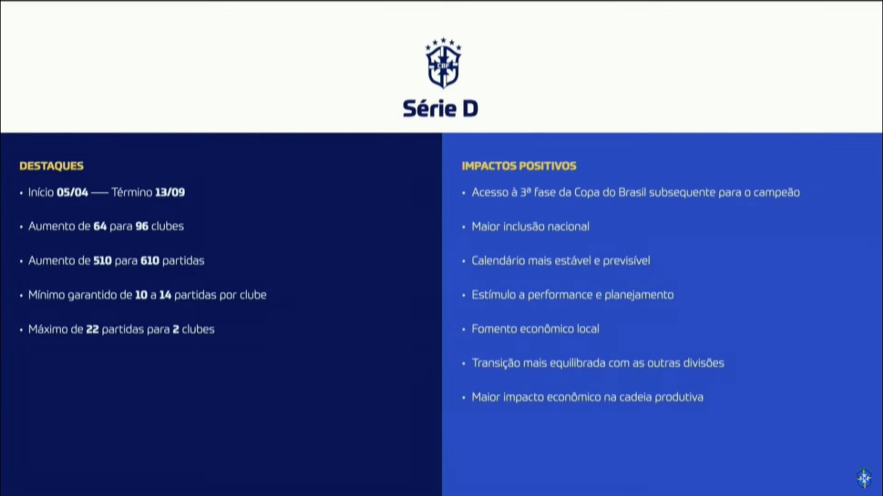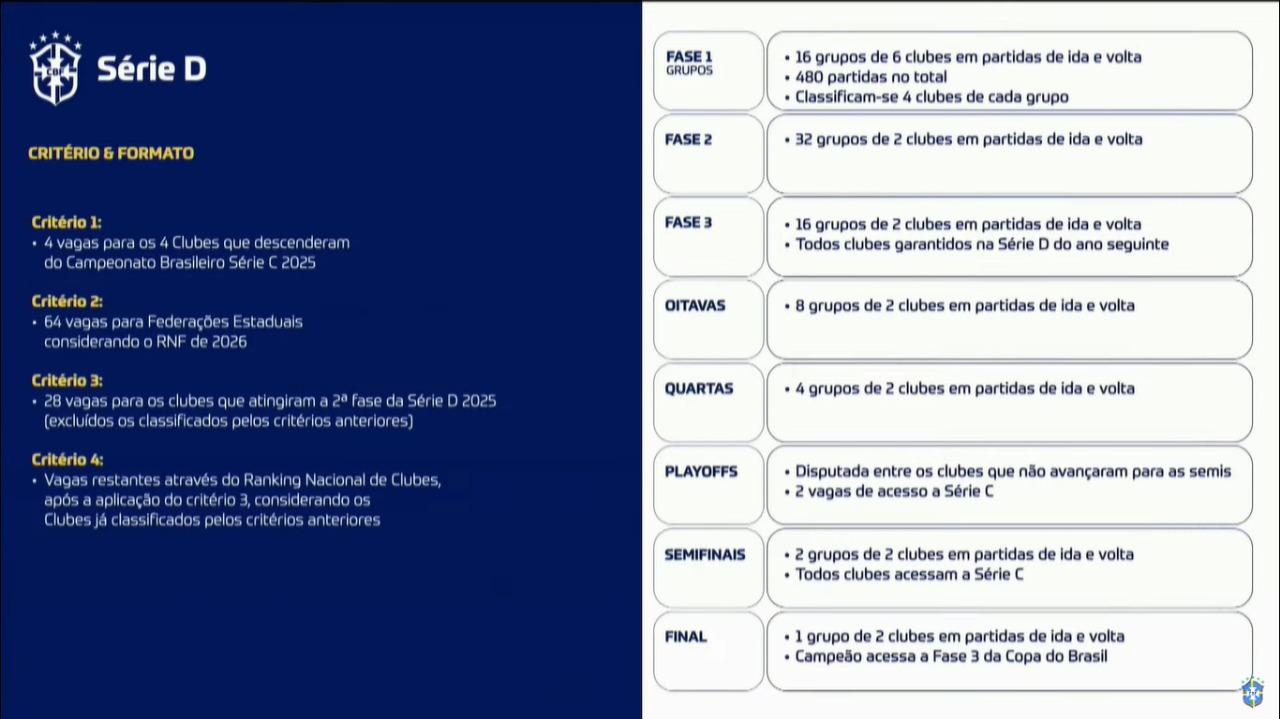 A Confederação Brasileira de Futebol anunciou mudanças na Série D em 2026. A competição agora passa a contar com 96 times, um acréscimo de 32 equipes para a próxima temporada. Com isso, Aparecidense e Goiatuba se juntam ao Crac, Abecat e Inhumas que conseguiram as vagas via Goianão 2025, para o torneio do ano que vem.