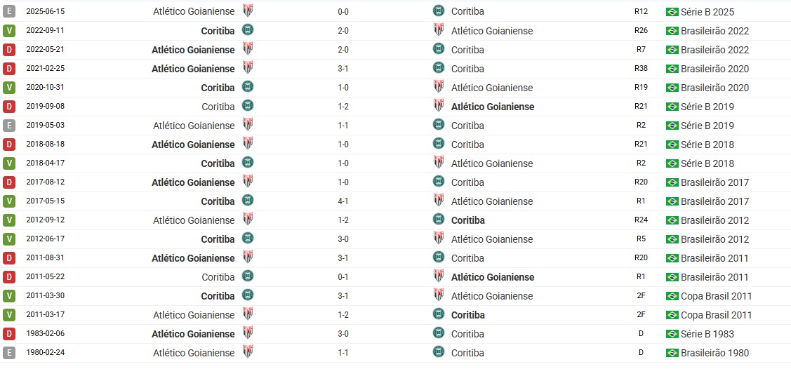 Em Curitiba são oito duelos realizados até o momento, com seis vitórias do Coxa e duas do Dragão. Em Goiânia são 11 jogos, com seis triunfos do Atlético-GO, três empates e duas vitórias do Coritiba.