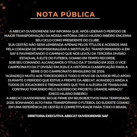 A Abecat informou de maneira oficial na noite desta quinta-feira (2), que Diego Hilário não é mais o presidente do clube, os motivos pela saída do profissional não foram justificados. O dirigente encerra uma passagem de três anos à frente da Onça Pinta, onde desde 2023 conseguiu feitos de destaque na história da agremiação.