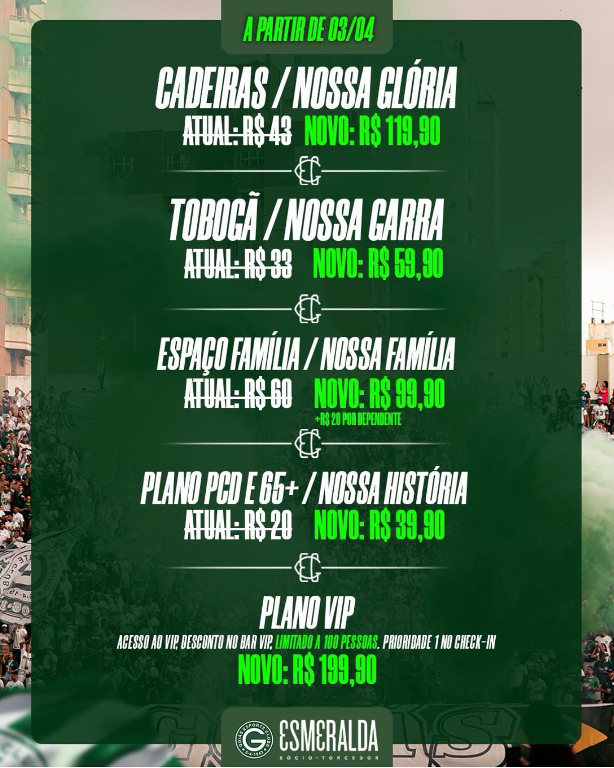 O Goiás divulgou nesta quinta-feira (26) os novos valores do programa de sócio-torcedor do clube. O Sou Esmeralda vai sofrer um reajuste no dia três de abril. Os torcedores que adquirirem até o dia dois, na modalidade anual, garantirá o valor atuar. Nos novos preços, os planos de cadeira irão custar R$ 119,90, Tobogã R$ 59,90, Espaço Família R$ 99,90 e Idosos e PCD R$ 39,90, mensais.