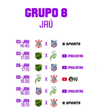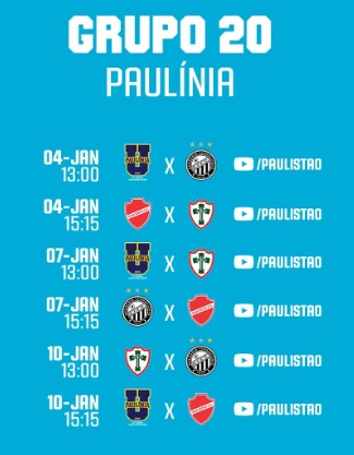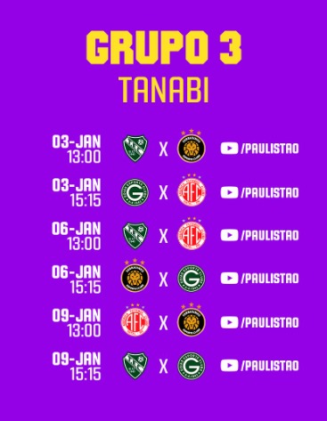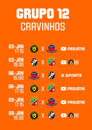 O Guanabara City, vice-campeão goiano, começa diante do i9 FC, às 17h15, o grupo ainda tem Velo Clube e Vasco da Gama. Por fim, o Vila Nova pega a Portuguesa-SP no dia quatro, às 15h15. A chave do Tigrão ainda conta com o Operário-PR e o Paulínia.