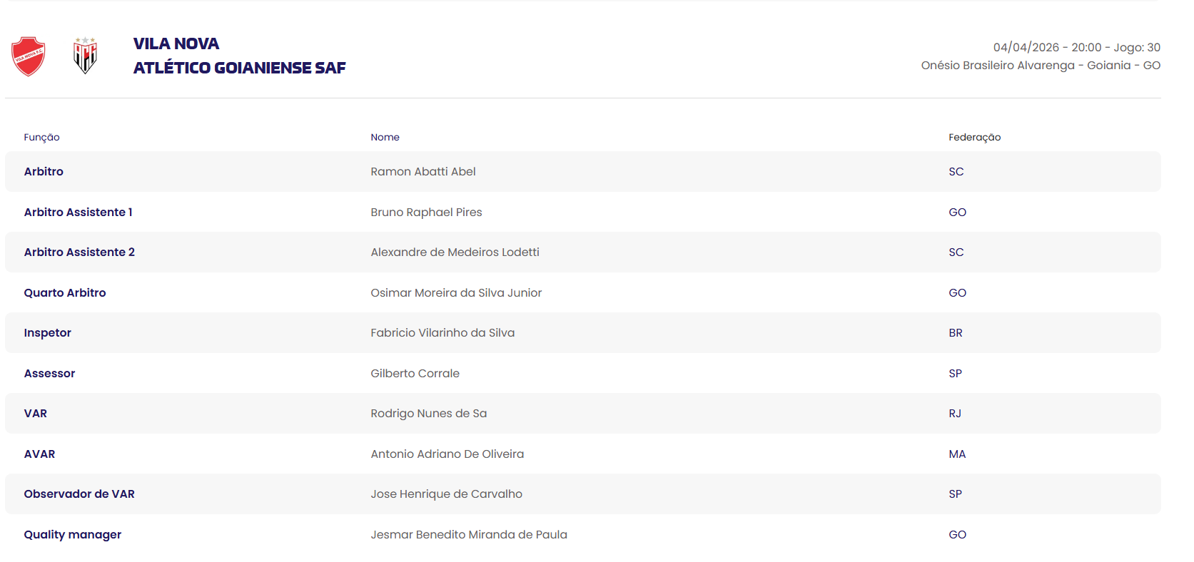 O primeiro clássico goiano da Série B 2026 terá Ramon Abatti Abel como responsável pelo apito. O catarinense foi o escolhido pela CBF para comandar Vila Nova x Atlético-GO, na terceira rodada do nacional. O jogo será disputado às 20h de sábado (4), no OBA.