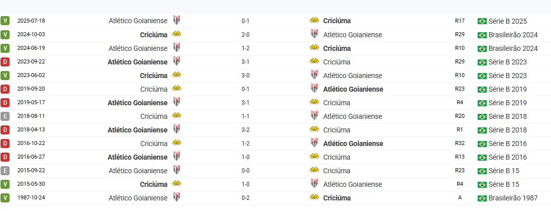 O último duelo das equipes ocorreu na 17° rodada da atual Série B, no dia 18 de julho no Antônio Accioly. O Criciúma venceu por 1×0. Confira todos os jogos entre os clubes na arte do site O GOL.