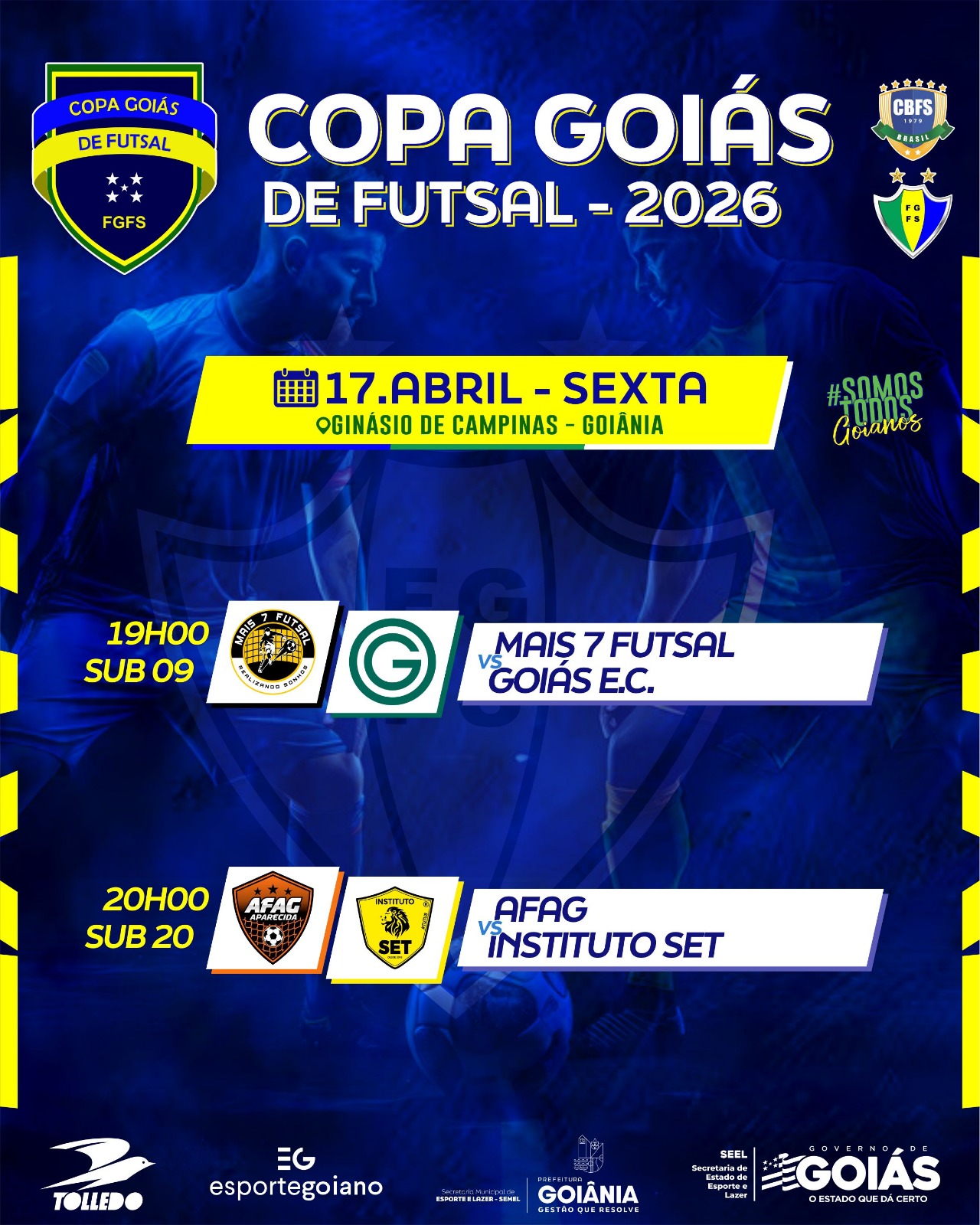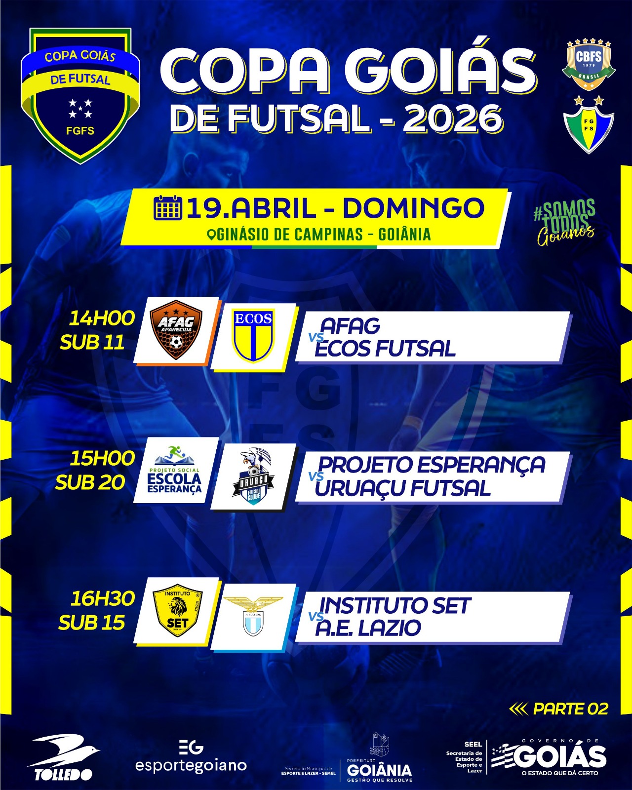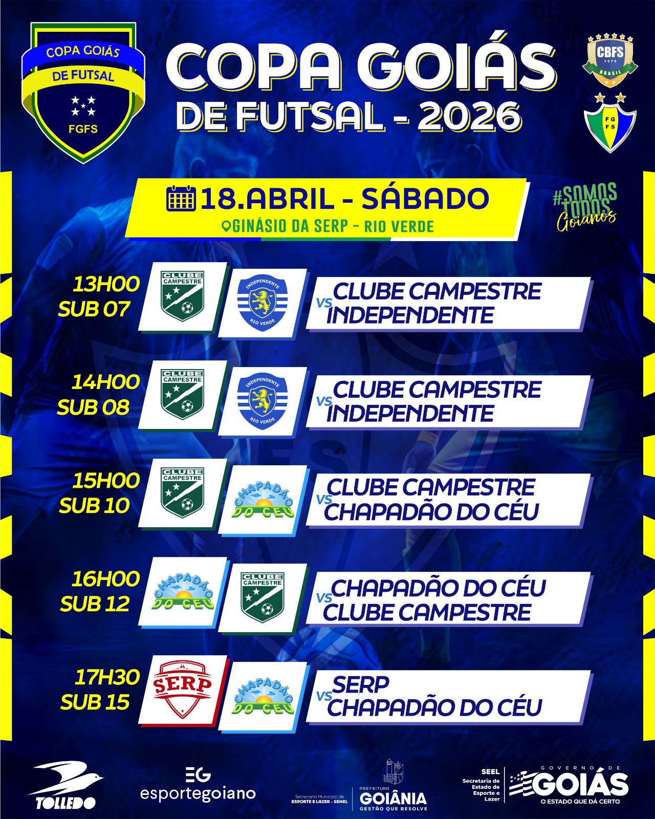 A Copa Goiás de Futsal terá mais uma rodada sendo executada neste final de semana, na sexta (17), sábado (18) e domingo (19). Serão ao todo 23 jogos entre as categorias Sub-7, 8, 9, 10, 12, 15, 16, 17 e 20, além de um duelo pelo adulto. O confronto será entre Chapadão do Céu x Instituto Ajax, no domingo (19), às 16h, no Ginásio Rodrigues Cunha, em Chapadão.