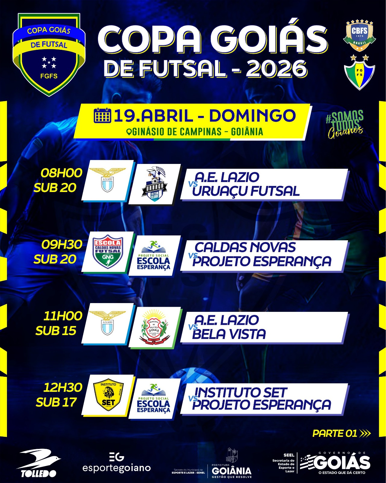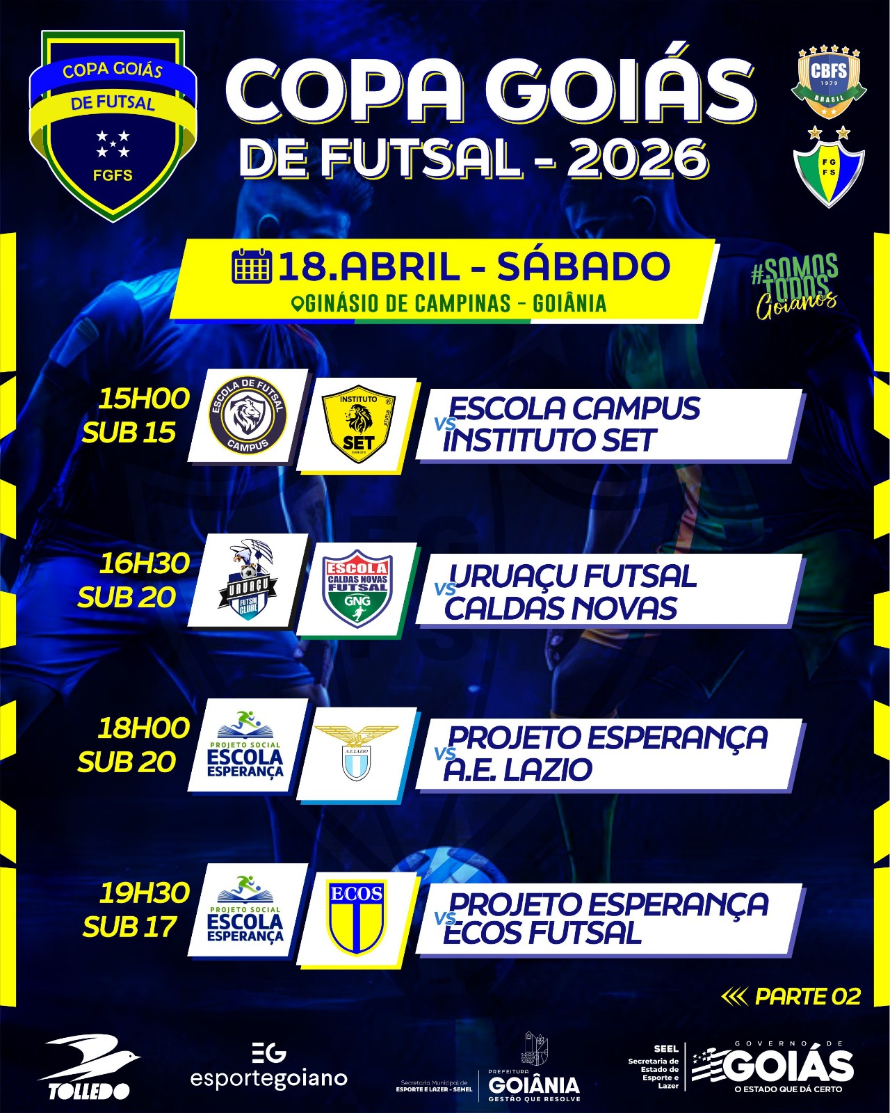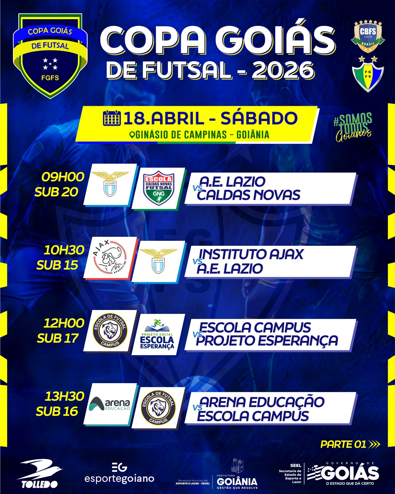 A Copa Goiás de Futsal terá mais uma rodada sendo executada neste final de semana, na sexta (17), sábado (18) e domingo (19). Serão ao todo 23 jogos entre as categorias Sub-7, 8, 9, 10, 12, 15, 16, 17 e 20, além de um duelo pelo adulto. O confronto será entre Chapadão do Céu x Instituto Ajax, no domingo (19), às 16h, no Ginásio Rodrigues Cunha, em Chapadão.