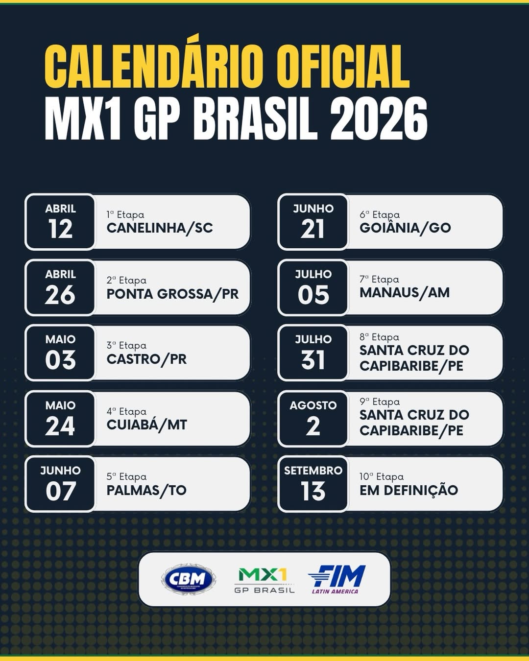 A Confederação Brasileira de Motociclismo (CBM) divulgou o calendário do Campeonato Brasileiro de Motocross/MX1 GP Brasil Sportbay 2026, organizado pela Promox. A temporada começa em 12 de abril, em Canelinha (SC), e termina em 13 de setembro, com o local da última etapa a definir.