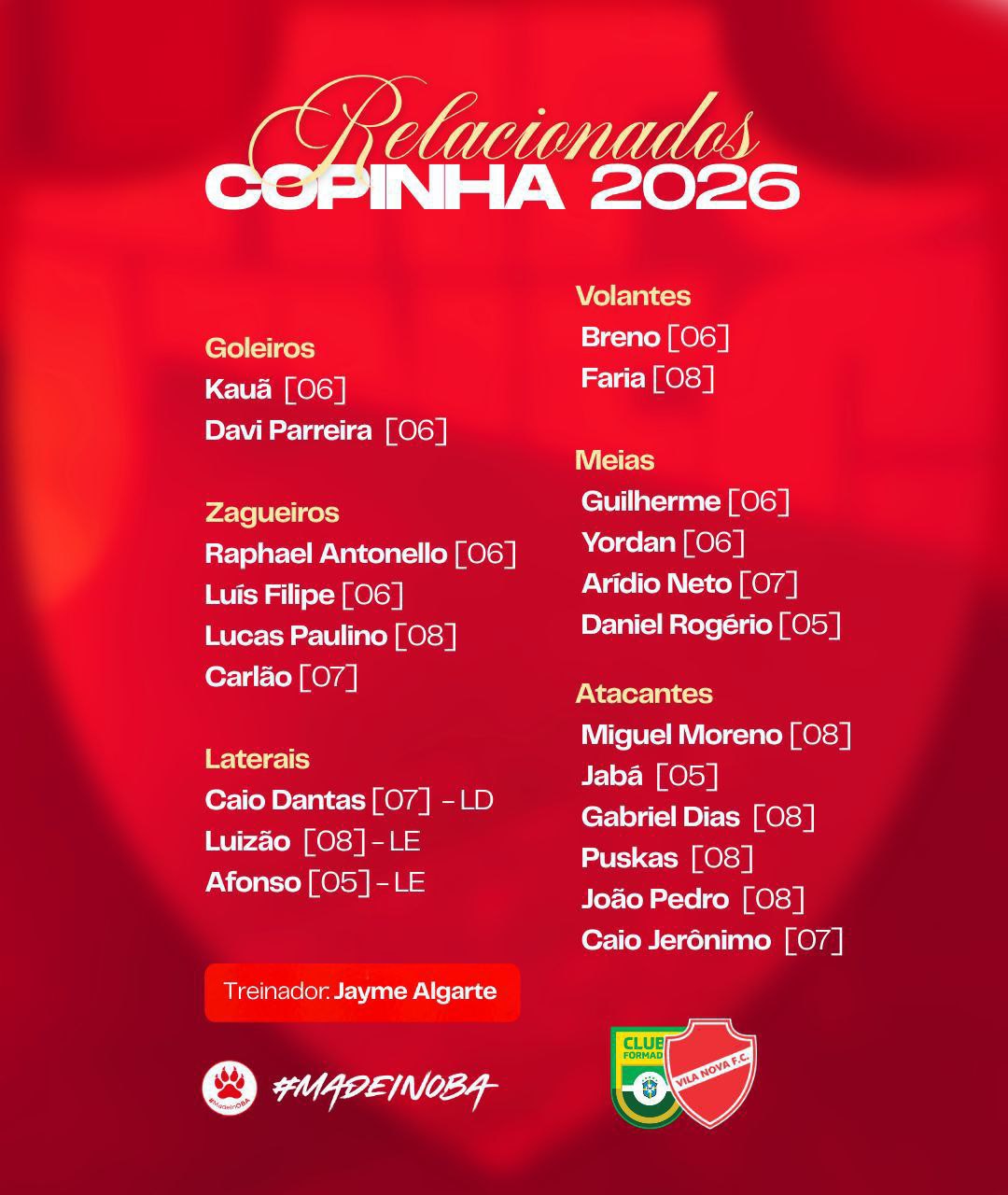 O Vila Nova definiu o elenco que vai disputar a Copa São Paulo 2026 nesta quinta-feira (1°). Serão 21 atletas sendo sete nascidos em 2008, quatro de 2007, sete de 2006 e três de 2005. A equipe será comandada pelo técnico Jayme Algarte.